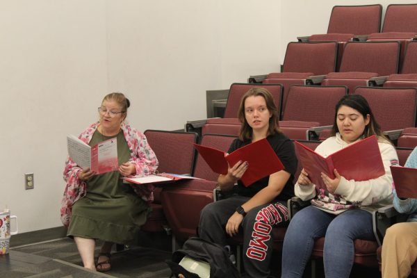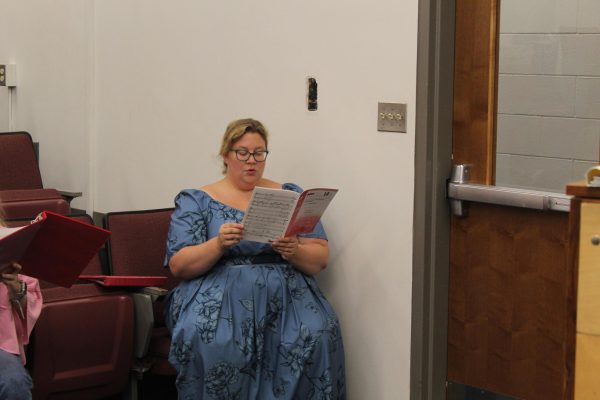 Halfway through the practice, a new singer joined in, and everyone welcomed her with open arms. Elizabeth Pennington, the Treasurer for Cougar Music and longtime member of the Cougar Choir, wants all participants to feel welcomed in this group, no matter where they’re starting from. “We want to make sure it is a space where everyone feels safe, loved, and free, without all the unnecessary pressure. Especially for college students, the stress is real, man.” This is Lily Peebles’ first year at IUK. She has been singing most of her life, and is thankful to have a space like the Cougar Choir to continue embracing her love of singing. In the future, she’s interested in pursuing voice acting, which can be helpful to prepare for if someone’s routinely singing. Even though she’s new, she already feels like a part of the group. “It’s easier to talk to people here, because we have more in common,” says Peebles.